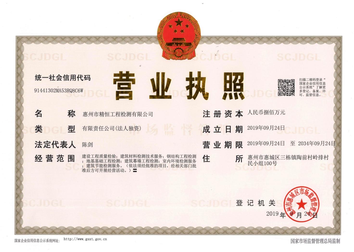 惠州市精恒工程检测有限公司是荣耀体育最新官方旗下的全资子公司,位于惠州市惠城区三栋镇陶前村岭排村民小组100号,成立于2019年9月24日,注册资本800万元,是一家专业从事第三方检测、具有独立法人资格的检验检测服务机构。