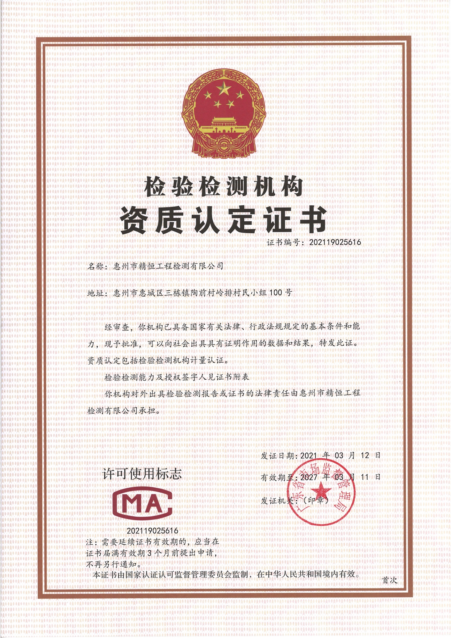 2021年3月12日,我司取得广东省市场监督管理局颁发的检验检测机构资质认定证书,同年6月10日取得惠州市住房和城乡建设局颁发的建设工程质量检测机构资质证书。主要检测范围:建筑工程材料检测、建筑门窗工程检测、装饰装修材料检测、主体结构工程检测、市政工程现场检测、建筑电气检测、建筑节能检测等。