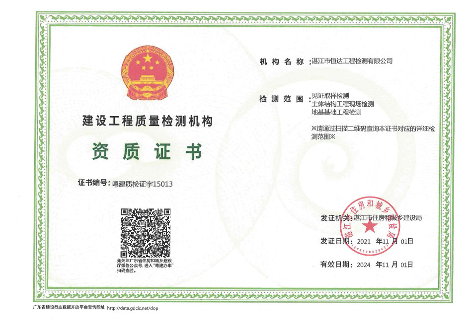 湛江市恒达工程检测有限公司取得以下资质证书: